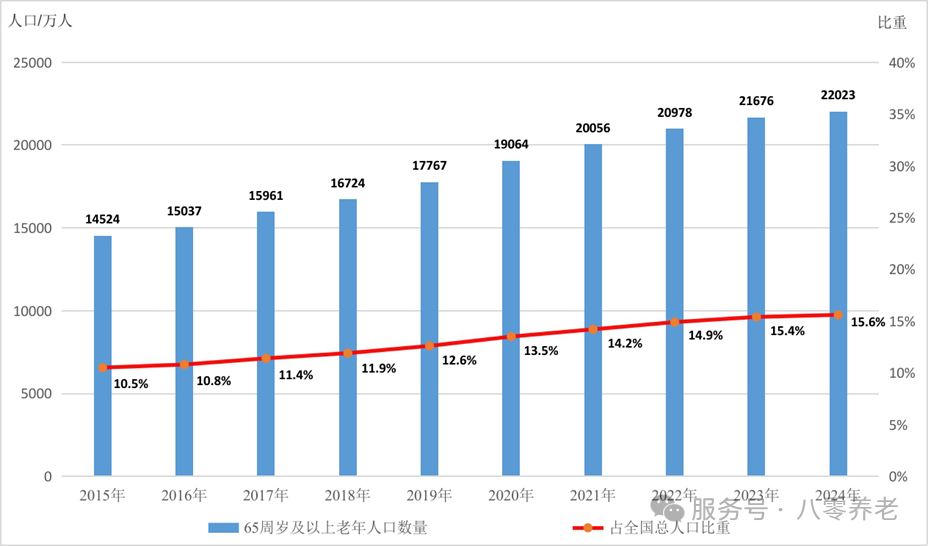 ▲图2 2015—2024年全国65周岁及以上老年人口数量及占全国总人口比重